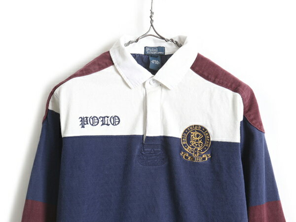 ボーイズ L メンズ XS 程■ POLO ポロ ラルフローレン トリコカラー 切替 肩 キルティング 補強 長袖 ラガーシャツ 古着 ラグビーシャツ| 中古 男性 RALPH LAUREN ラグビー ラガー 長袖シャツ コットンシャツ ネイビー バーガンディー ホワイト レディース S 程 ラルフ