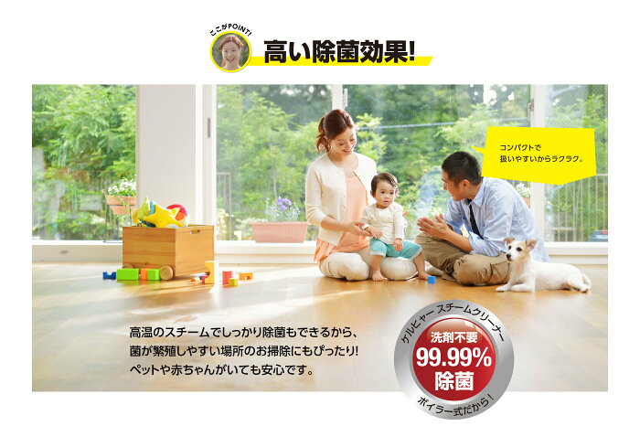 【用途】 掃除 清掃 湯垢(湯アカ)の掃除 車内清掃 洋服の染み抜き しわ伸ばし 除菌 大掃除など 【清掃場所】 台所 ガス台(油汚れ) ガスコンロ シンク シンク周り 流し 換気扇 洗面所 洗面台 お風呂 電子レンジ オーブンレンジ ト イレ 車のシート ソファ イス(椅子) 床 フローリング カーペット じゅうたん 畳 タイル 窓 サッシ サン エアコン(フィルター フィン) 鏡 など 【性能】 電 源:100V 50/60Hz共用 ヒーター出力:1200W スチーム吐出圧力:0.3MPa 清掃面積:20平方メートル(約6畳に相当) スチーム連続噴射時間:約6分 ヒートアップタイム:約3分 タンク容量:0.2リットル 本体質量:1.6kg 本体寸法:321 x 127 x 186(LWH)mm 定格使用時間:1時間(電源スイッチが入ってる合計時間) ・標準装備品 フロアノズル、フロアノズル用クロス、延長パイプ2本、ハンドブラシ、 ハンドブラシカバー、延長スチームホース、ノズルヘッド、ブラシ2個